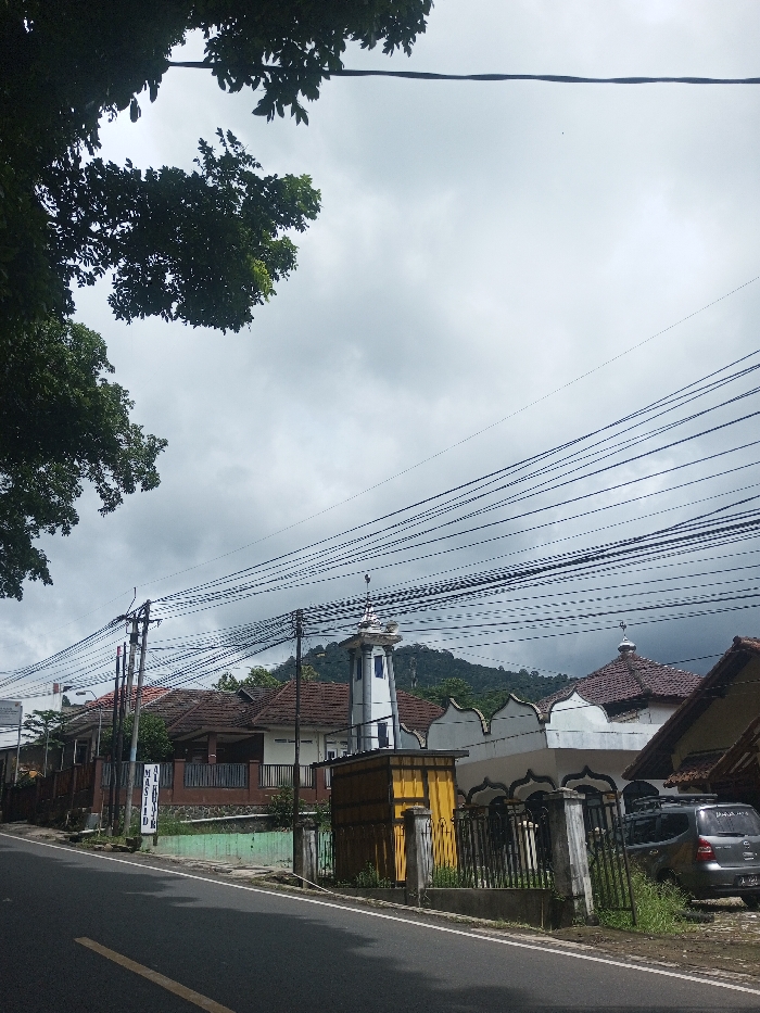 A street view shows a mosque with a white minaret and tiled roof under a cloudy sky, partly obscured by numerous power lines. A mountain range is visible in the background. Buildings line the street, and a dark asphalt road runs along the foreground, marked with a yellow line. Lush green trees hang over the left side of the frame. A silver car is parked beside the mosque.