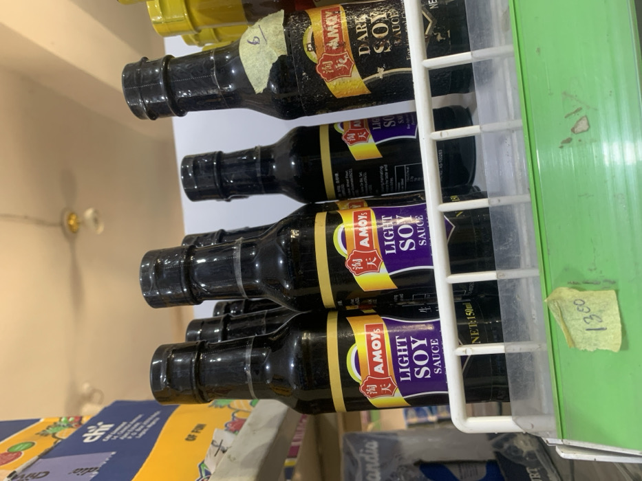 The image depicts an indoor scene within a retail store, specifically a supermarket or grocery store, located in Aviation Quarters, Nigeria. The primary focus is on a display of multiple dark-colored bottles of Amoy's brand soy sauce, arranged upright on a white wire rack that sits atop a prominent green shelf. In the foreground, a small, light green rectangular paper tag with the handwritten number "1300" in dark ink is affixed to the front edge of the green shelf. The bottles are of two types: "Light Soy Sauce," identifiable by their purple and yellow labels, and at least one bottle of "Dark Soy Sauce," distinguished by its yellow and red/orange label. Most bottles have a clear plastic shrink-wrap seal over their black caps. One bottle of "Dark Soy Sauce" on the right side has a light yellow adhesive note with the number "6" written on it, affixed to its upper body. In the background, other retail shelving units are visible, holding various products. Partially visible packaging includes blue and yellow boxes, possibly from the "Chi" brand, and white packaging. The ceiling above is white, and a gold-colored ceiling fan with multiple blades is visible in the upper center of the frame, indicating an operational indoor environment. No individuals are present in the image.