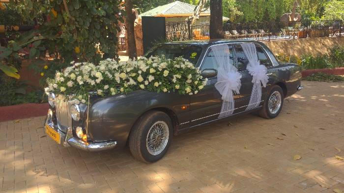 A dark gray vehicle, designed with a vintage aesthetic, is parked on reddish-brown interlocking paver stones. The entire hood of the vehicle is densely covered with an arrangement of white roses and other white flowers, interspersed with green foliage. White sheer fabric bows are attached to both side mirrors and extend along the passenger side doors as streamers. The car features a prominent chrome grille, circular headlights, and multi-spoke chrome wire wheels. A yellow license plate on the front bumper reads "TO IMANI" and "KARATU". The scene is set outdoors in bright daylight, indicated by shadows cast on the pavement. To the immediate left of the car is dense green vegetation. In the background, a low retaining wall separates the paved area from a raised section featuring a swimming pool, several lounge chairs, and a large, light-colored statue resembling an elephant. A building with a green roof is visible amidst trees further back in the center. No individuals are present in the scene, and no actions or interactions are occurring. The location is Karatu, Tanzania, as indicated on the vehicle's license plate.