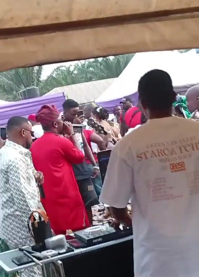 live band performing under a white tent, with a crowd of people gathered around. The band includes a singer in a red outfit, a saxophone player, and a DJ. The crowd includes people of various ages and genders, dressed in colorful clothing. Many of them are recording the performance on their phones. The environment appears to be an outdoor event, possibly a wedding or a festival. There is green grass visible, and the tent provides shade for the performers and the audience.