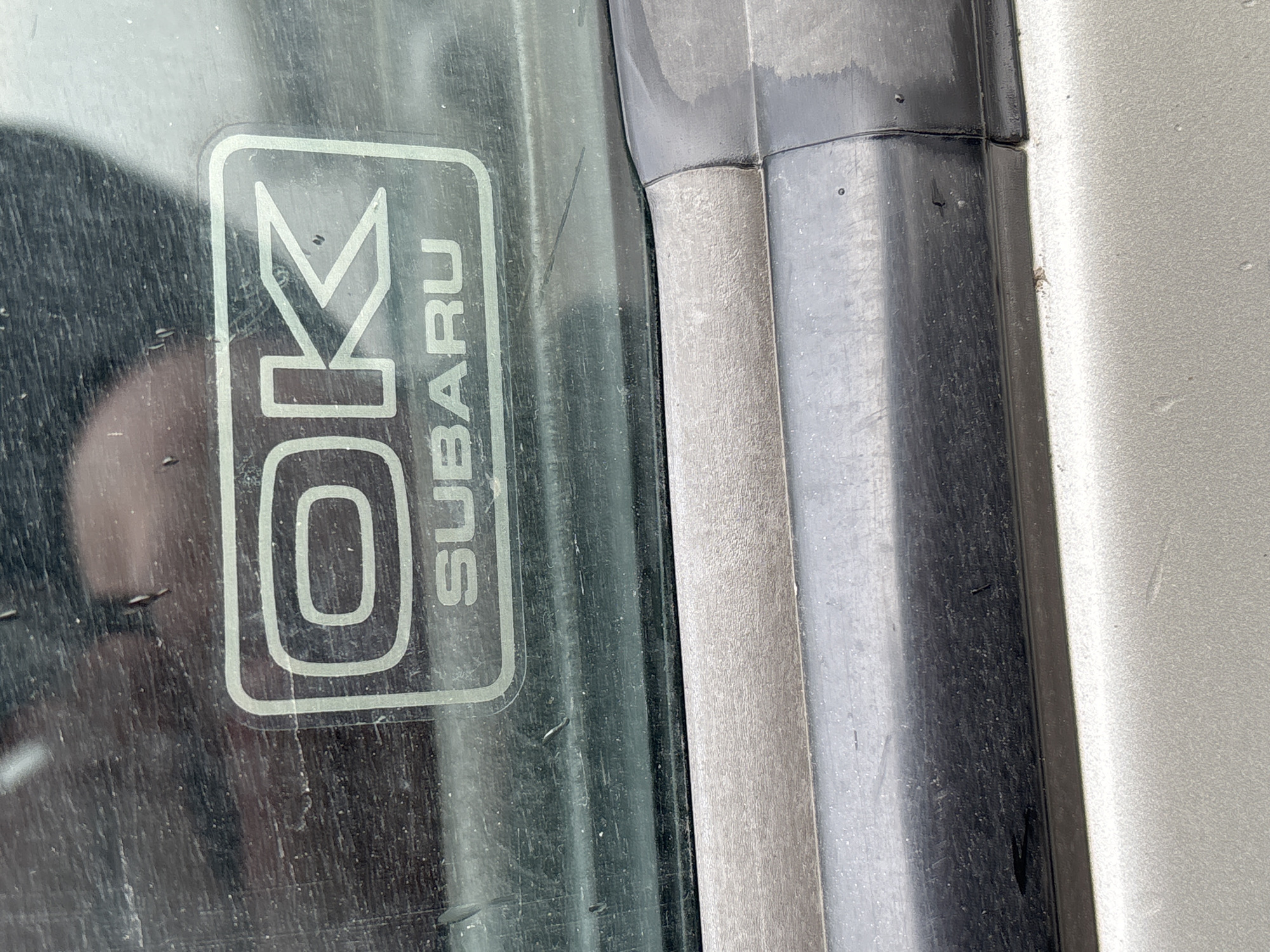 The scene is located in the city of Ruptsi, Bulgaria. The image provides a close-up, downward-angled view of a vehicle's exterior. The primary subject is a light-colored rectangular sticker with rounded corners, affixed to a dark-tinted vehicle window. The sticker displays the outlined capital letters "OK" prominently, with the word "SUBARU" in smaller, solid capital letters centered beneath it. The window glass is visibly dirty with dust, grime, and faint streaks, and exhibits reflections of an indistinct, possibly overcast, external environment and a distorted internal object or limb. Below the window, a textured, light grey, weathered trim piece runs horizontally. Directly beneath this, a darker, matte black plastic trim element is present, also showing dirt and minor wear. The lowest visible section of the image shows a portion of the vehicle's body panel, painted in a light metallic color, possibly silver or champagne, with a dusty and slightly textured surface. No people are directly depicted, but a reflection suggests proximity to an individual. The overall condition of the depicted surfaces indicates a lack of recent cleaning and exposure to environmental elements.