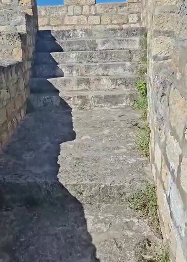 set of stone stairs leading up to a stone wall with a blue sky and a flag visible above it. The stairs are worn and appear to be part of an old structure, possibly a castle or fortress. There are weeds growing along the sides of the stairs and the walls. The sun is shining, casting a shadow on the ground.
