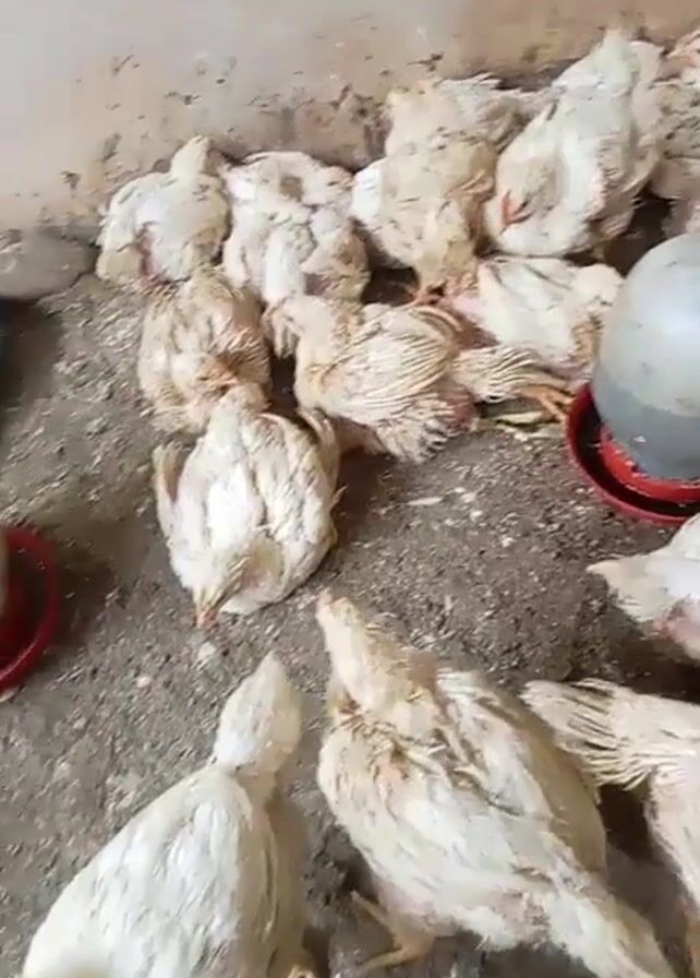 A number of young white chickens are in a concrete enclosure. Most are resting on the floor, appearing lethargic or ill. There are a few water dispensers scattered around the enclosure. Some chickens move slightly, while others remain still. The environment appears unclean, and the chickens’ overall condition suggests a possible health issue.