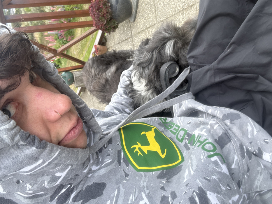 A selfie featuring a person in a gray camo-patterned hoodie with a John Deere logo. The person has fair skin, curly brown hair, and a nose ring. A gray, fluffy dog is visible behind them, partially obscured. The background shows a tiled surface, a flower box with pink flowers, and a section of a wooden railing. A dark gray jacket is draped to the right of the person.