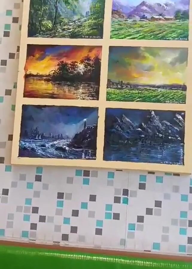 framed collection of eight small landscape paintings arranged in a grid. The paintings feature various scenes: a river with a red tree, a village amidst hills, a lush forest, mountains with a green meadow, a fiery sunset over water, a green field under a cloudy sky, a coastline with a lighthouse, and a dark mountainous seascape. The frame is light-colored. The collection rests on a table with a colorful tiled surface and a green edge. Part of a laptop is visible in the corner of the frame. The camera moves slightly, providing close-ups of the individual paintings.