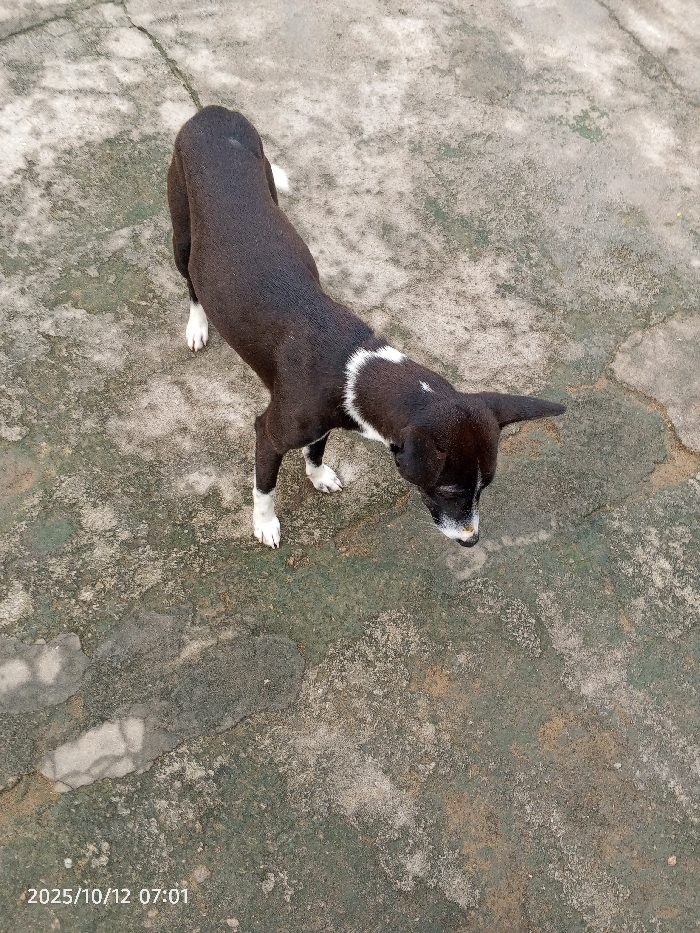 The image displays a lean black and white dog standing on a weathered concrete surface in Kamantan, Nigeria, on October 12, 2025, at 07:01