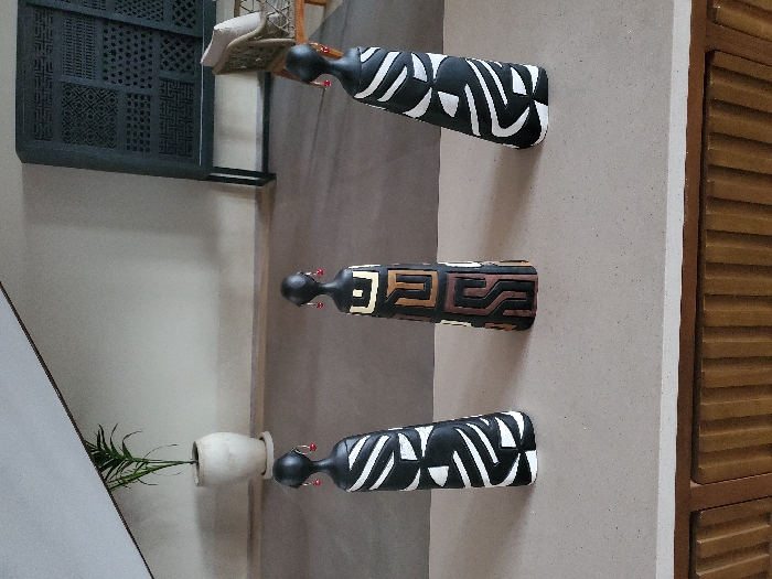 Three elongated, cylindrical sculptures adorn a wall. The topmost and bottommost sculptures feature a black base with bold white geometric designs. The middle sculpture showcases intricate brown and black patterns resembling a maze. Each sculpture has a small, round red bead at one end, presumably representing the head. To the left, a potted green plant sits on a surface, while a slatted wooden door is visible to the right. A decorative latticework panel is seen in the background.
