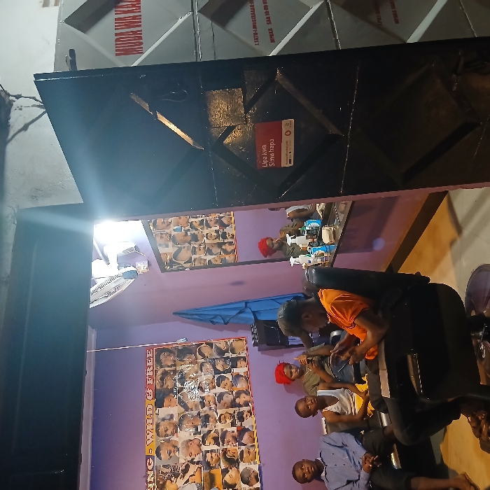 The image depicts the interior of a barbershop located in Mji Mpya, Tanzania, viewed through its partially open entrance at night, indicated by artificial lighting