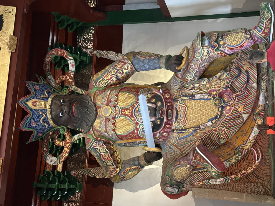 The image depicts the interior of a temple hall, specifically within Lingyin Temple (灵隐寺) in Xihu District, Hangzhou, Zhejiang Province, China. The central subject is a large, multi-armed, seated Buddhist guardian statue. The statue possesses a dark, wrathful face with wide-open eyes, bared teeth, and a prominent black beard. It wears an elaborate, multi-layered crown featuring a small Buddha figure. The figure's ornate armor is richly decorated with intricate patterns in gold, red, blue, and green. A light-colored sword is held horizontally across its midsection by one of its hands. Another hand holds a golden ring. The statue is seated with one leg bent and foot raised, while the other leg is bent with the foot on the ground. Behind and above the statue, dark red wooden beams and ornate green architectural elements are visible, along with a gold-colored panel displaying Chinese script. In the lower right foreground, a male individual is visible from behind, wearing a red collared shirt, observing the statue.
