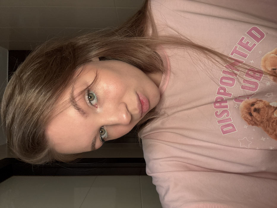 A forensic description of the scene depicts a young Caucasian female captured in a close-up, chest-up selfie. She possesses light skin, green eyes accented with light blue eyeliner on the lower lash line, a small nose, and slightly parted lips with a natural sheen. Her light brown hair is long, styled with a soft part, and falls over her shoulders. She is wearing a light pink, short-sleeved t-shirt featuring the text "DISAPPOINTED CLUB" in darker pink capital letters, positioned above graphics of at least two small, light brown, fluffy puppies and faint white stars. The subject is looking directly into the camera with a neutral expression. The background reveals an indoor setting with subdued lighting; a dark vertical panel or door frame is visible on the left, and muted brown tiled walls are present behind her and to the right, suggesting a bathroom or similar interior space. The location is the city of Vozdovac Urban Municipality, Serbia.