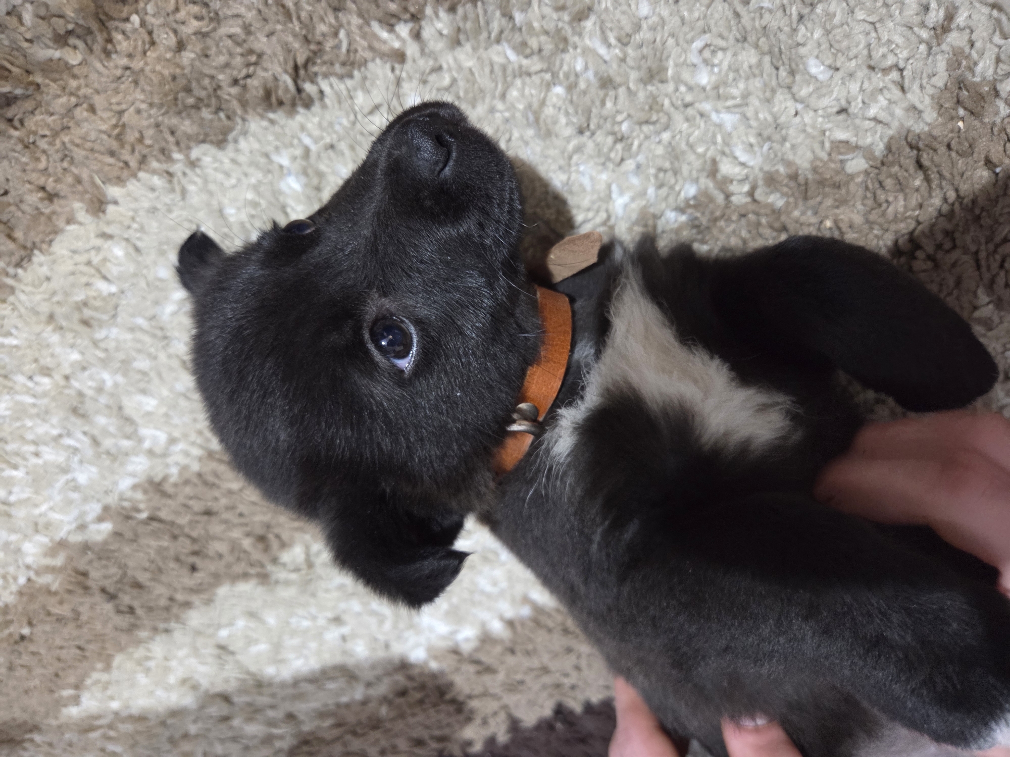 A black puppy with a brown collar is lying on a beige and brown carpet. The puppy is facing upwards. The location is unknown, Pchelnik, Bulgaria not confirmed. A hand is holding the puppy.
