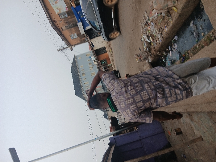 A man wearing a patterned shirt and light-colored pants stands on a street. A green object is visible around his neck. In the background, buildings of various heights line the street. A black car is parked near one of the buildings. Debris and trash are visible along the side of the street. A utility pole with wires extends into the sky. A blue object is in the lower foreground.