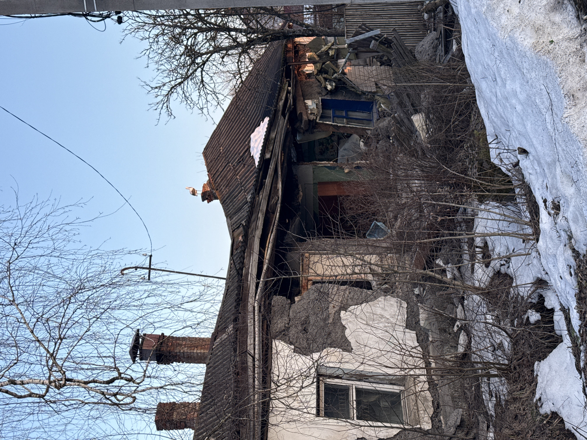 The image depicts a severely dilapidated single-story house in Rybinsk, Russia, under a clear, light blue sky, suggesting early morning or late afternoon. The house features a gabled roof made of dark corrugated material, significantly damaged and partially collapsed in its central and right sections. Two brick chimneys are visible on the roof, with a prominent white stork standing on the central chimney's peak. The exterior walls are primarily light-colored, but large sections of plaster have fallen away, exposing underlying grey concrete or stone and structural damage. A multi-paned window is present on the intact left side of the front wall. The central and right portions of the house are extensively ruined, revealing an interior filled with debris, including a visible blue window frame amidst rubble. The immediate foreground and areas surrounding the house are covered with patches of melting snow and dark, exposed earth, interspersed with numerous bare, thin-branched shrubs and trees. A large bare deciduous tree with intricate branches occupies the upper left, while a utility pole with wires stands on the far right. No people are visible in the scene.