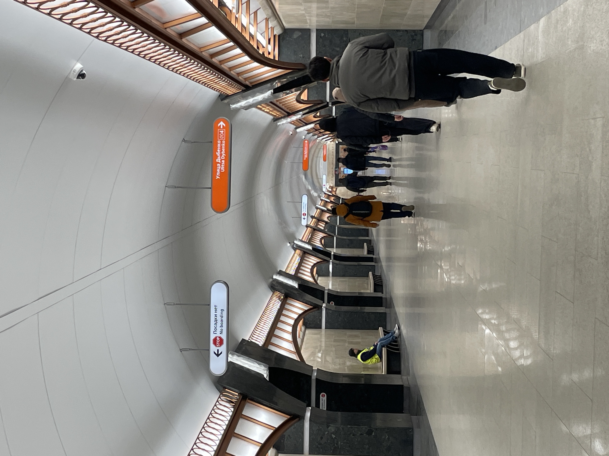 The image captures a view inside the Ulitsa Dybenko metro station in Saint Petersburg, Russia. The station's architecture features a curved, white ceiling with integrated lighting and decorative brown accents. Passengers are walking along the platform. Directional signage is visible, including signs for "Ulitsa Dybenko" and "No boarding." One person is sitting on a bench. The flooring is light-colored and reflective. A security camera is mounted on the ceiling.