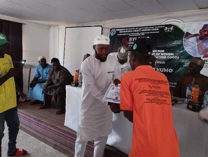 The image captures a scene in a room with a large white board bearing the inscription "Nigerian Institute of Leather and Science Technology (NILEIST) Jami'u Zaria