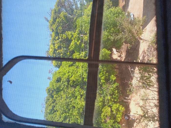 The image displays an outdoor scene in Kuru Dungus, Nigeria, viewed through an arched window with a dark frame and visible screen mesh. The upper frame shows a clear blue sky extending above a dense canopy of vibrant green trees. Faint horizontal utility lines are visible cutting through the tree line. The mid-ground features a dry, light brown ground surface, sparsely covered with smaller green trees and shrubs. A dark-colored, four-legged animal, consistent with a goat or sheep, is positioned on the left side of the frame, facing away from the viewer with its head lowered towards the ground. A light-colored vehicle is partially visible on a level surface to the right. A small, dark, irregular object is present on the window screen in the upper left quadrant of the frame.