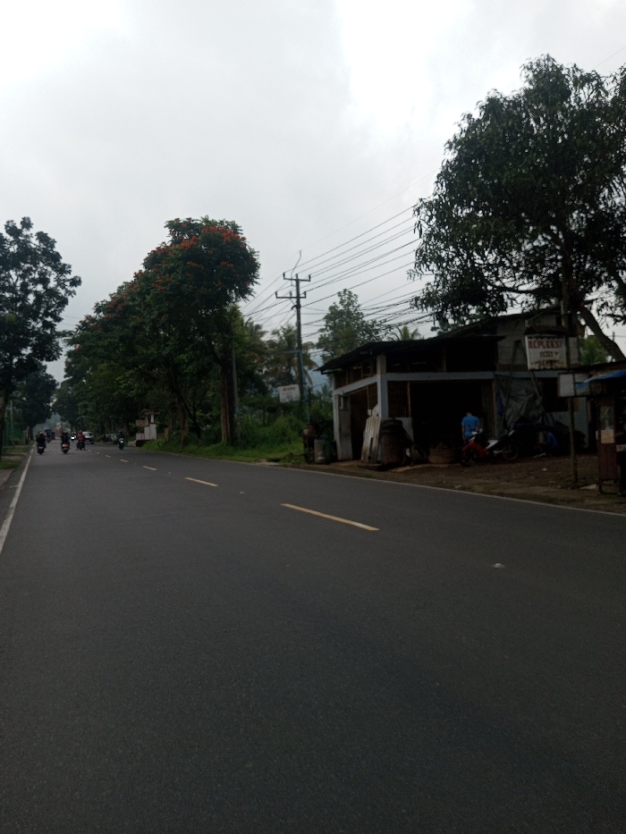 The scene depicts a street in Sandamal Eliya, Sri Lanka, under an overcast sky. A dark grey asphalt road occupies the foreground and midground, featuring a solid double yellow line delineating the left shoulder and a single dashed yellow line marking the right lane. Several motorcycles, some with multiple riders, are visible in the distance on the left side of the road, moving away from the viewer. On the right side of the road, a simple, open-fronted building with a dark roof and light-colored concrete pillars stands, appearing to be a commercial establishment. A sign affixed to the right side of this structure partially reads "REPLEKS PECI". In front of this building, a person wearing a blue shirt stands near a red motorcycle. Various objects covered by a dark tarp are visible behind the individual and the motorcycle. Further right, a smaller, less distinct structure is present. Utility poles with multiple overhead power lines are visible on the right, extending into the midground. Dense green foliage, including large trees, lines both sides of the road. Trees on the left side of the road feature some reddish-orange blossoms among their green leaves. The overall environment suggests a bustling, semi-urban or rural area.