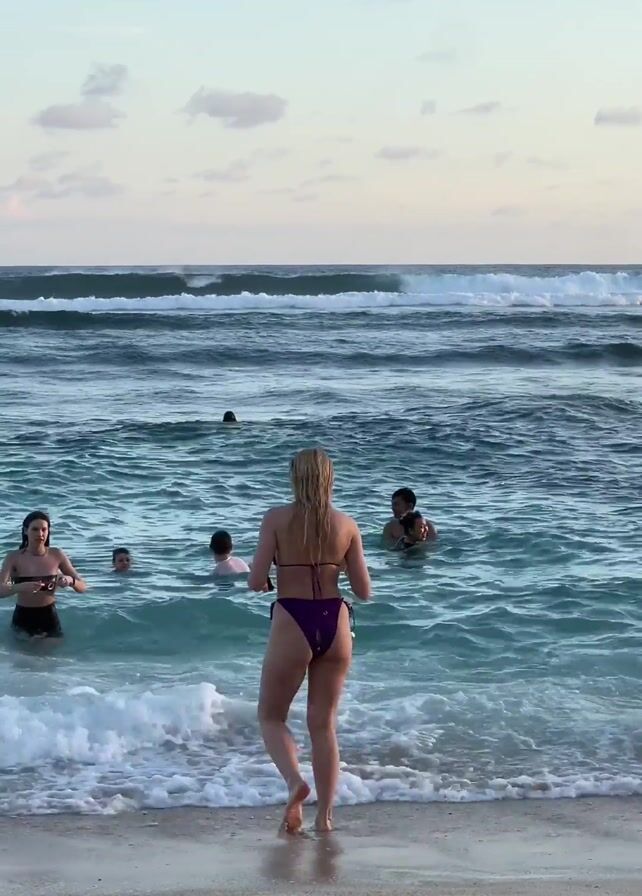 beach at dusk. Several people are in the ocean. One person is walking into the water, wearing a purple bikini. Another person wearing a pink top and shorts is walking by on the beach. The water is blue with whitecaps, and there are waves breaking in the distance. The sky is light blue with scattered white clouds. The beach is sandy.