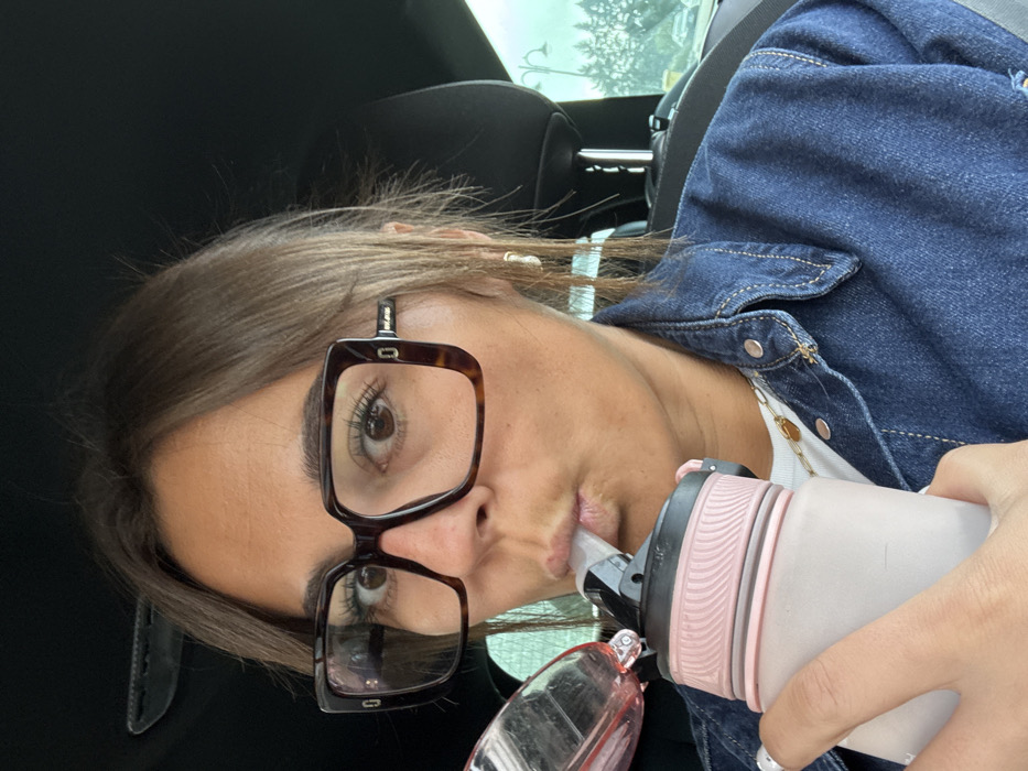 A female individual is depicted in a close-up, head-and-shoulders view inside a vehicle in Montrond-les-Bains, France. She has medium-brown hair, light brown eyes, and a tan complexion. She is wearing large, square, tortoiseshell-patterned prescription glasses, a dark blue denim jacket with copper-colored buttons and stitching, over a white top, and a visible gold-colored chain necklace with a small pendant. A small gold hoop earring is present in her right ear. She is actively drinking from a light pink or frosted-white water bottle with a pink textured grip and a black lid, utilizing its integrated clear straw. Her lips are pursed around the straw. Her left hand, with white-painted fingernails, holds the base of the bottle. The vehicle's black interior, including the headliner and a headrest, is visible. Through the vehicle's window on the right side of the frame, blurred green trees and a light pole are discernible, indicating an outdoor environment.
