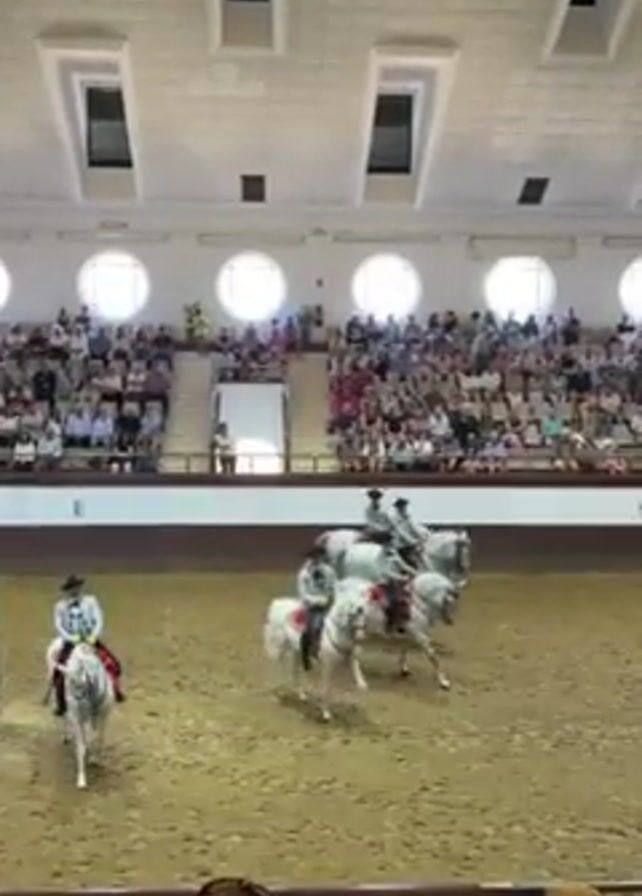 n indoor equestrian performance in front of a large audience. Several white horses, each ridden by a person in traditional attire, move in formation in the sandy arena. The arena is surrounded by tiered seating filled with spectators. The building has a high, white ceiling with multiple windows and skylights. A wooden railing separates the audience from the arena.