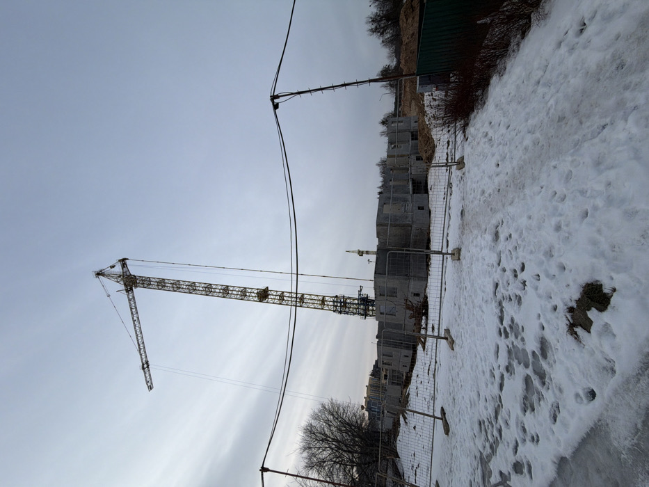 The image presents a winter scene at a construction site in Hrodna, Belarus, under an overcast sky