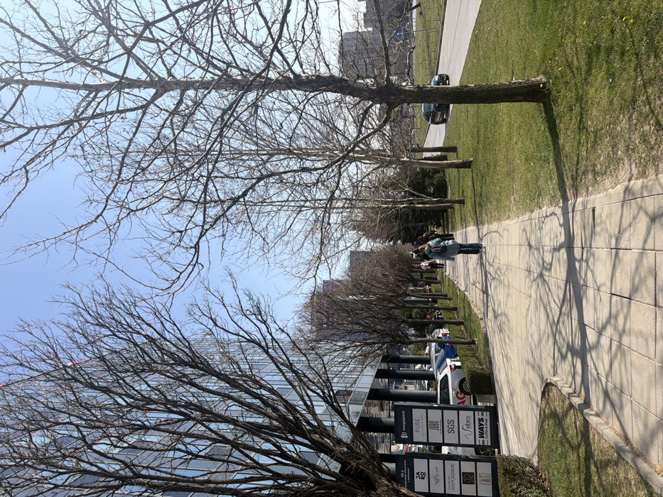 The image portrays an outdoor urban environment on a clear, sunny day in Sofia, Bulgaria, specifically along Tsarigradsko shose Boulevard, fronting the Megapark office complex. The scene is captured from a paved sidewalk looking generally northeast. On the left, a modern, multi-story office building with a reflective glass facade extends vertically and horizontally, identified by a prominent black vertical sign displaying "megapark" at its top, alongside other corporate logos and names such as "Pure," "JARO," "workspace," "SGS," "Vibes," and "WAYS Coffee & Shop." Below these signs, a parking area contains multiple parked cars of various colors, including white, blue, and grey. A hedge and bare deciduous trees line the base of the building and the parking area. The central feature is a wide, light-colored concrete tile sidewalk extending into the distance, marked with intricate shadow patterns from the numerous bare deciduous trees that line its left and right edges. To the right of the sidewalk, a strip of manicured green grass, showing sparse yellow blooms, separates it from a multi-lane asphalt road. Several pedestrians are visible on the sidewalk. In the mid-ground, a person wearing a light blue jacket and dark pants, carrying a backpack, walks away from the camera. Other individuals are present further down the sidewalk, partially obscured by trees. On the asphalt road to the far right, a dark-colored SUV is seen traveling away from the camera. The road appears clear of significant traffic. In the distant background, additional urban buildings and bare trees are visible against a bright, cloudless blue sky. The bare state of the trees indicates a late winter or early spring season.
