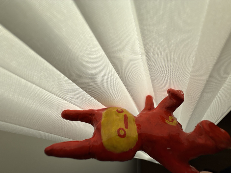 A close-up shows a red, seemingly handcrafted, animal figurine lying against a backdrop of white, pleated window blinds