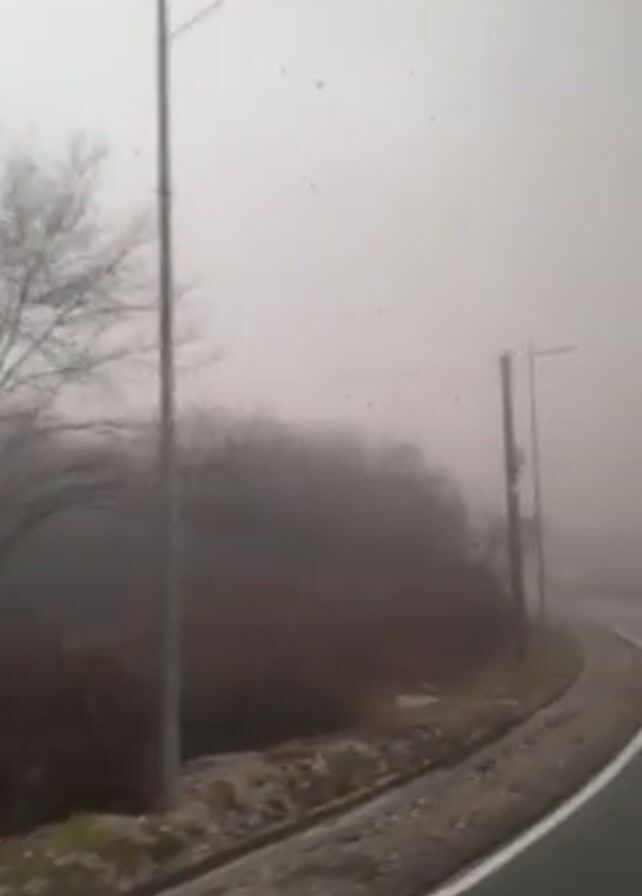 scene viewed from a moving vehicle on a foggy or misty day. The camera pans slowly, revealing a curved road with a white line marking the edge. The roadside features sparse vegetation, including bare trees and bushes. There are also utility poles and streetlights along the side of the road. The environment is heavily obscured by fog, creating a gray, muted atmosphere. The movement of the camera indicates the vehicle is traveling along the road. There are small dark spots on the camera lens or window.