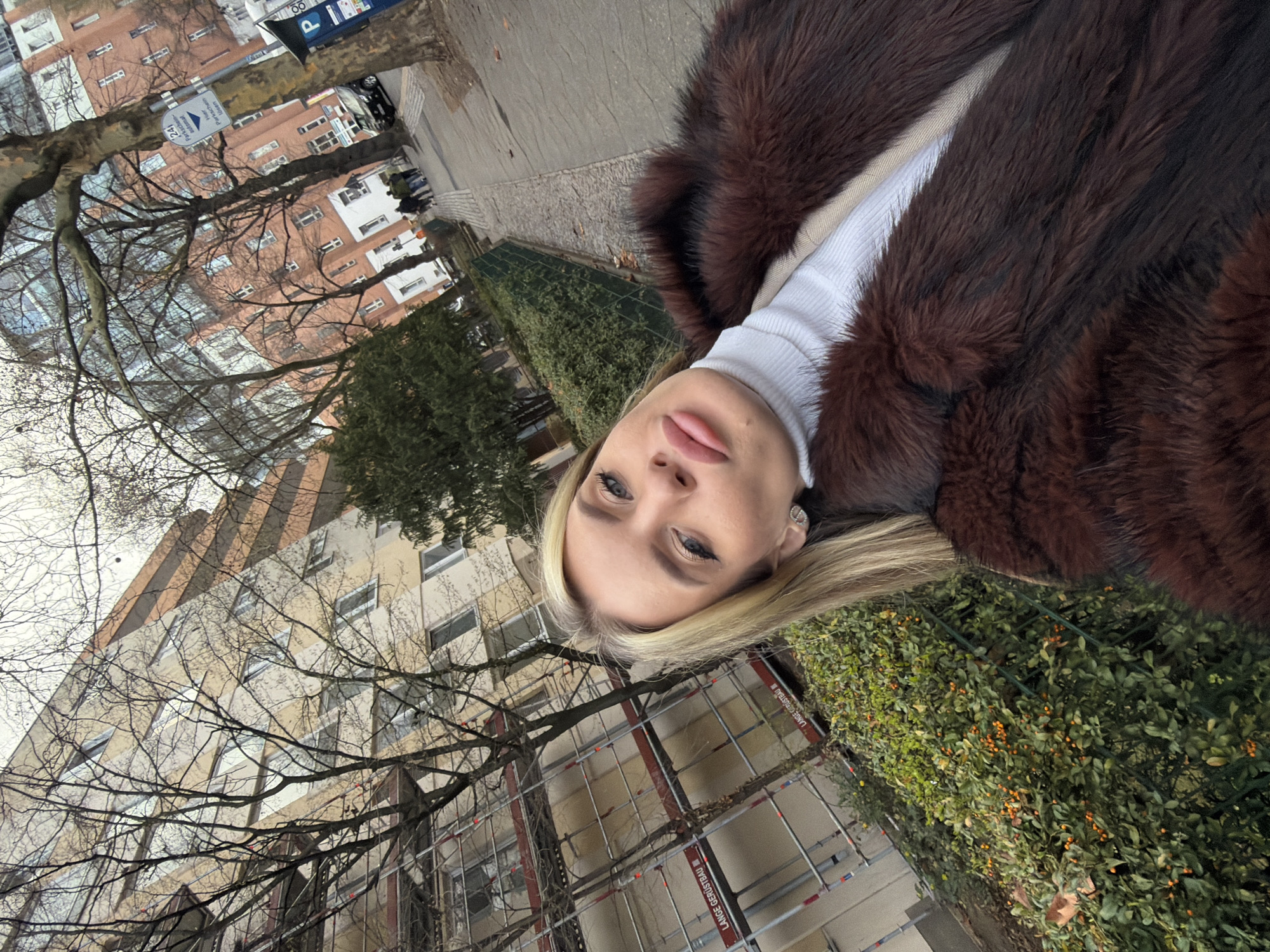 A blonde-haired woman with blue eyes is posing in front of a building in Berlin, Germany. She is wearing a brown fur coat over a white turtleneck. Scaffolding is visible near the building. A sign with the word "PARK" is present. Trees with bare branches are visible in the background.