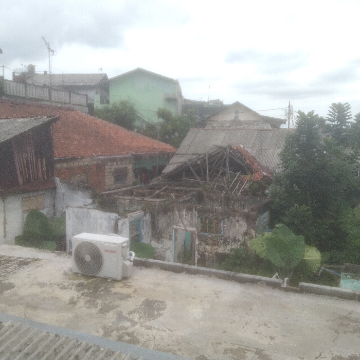 This image presents an overhead view of a densely populated residential area in Bogor, Indonesia, under an overcast sky. In the foreground, a white Sharp outdoor air conditioning condenser unit rests on a weathered concrete rooftop or terrace, with a section of a grey corrugated metal roof visible in the bottom left corner. The midground features several structures: most prominently, a severely dilapidated building with a collapsed red-tiled roof revealing exposed wooden rafters and weathered, stained walls. To its immediate left, another building with an intact red-tiled roof and exposed brickwork is visible. Various green trees and shrubs are interspersed throughout the scene, some appearing overgrown around the dilapidated structure. In the background, additional residential buildings are visible on higher ground, including a light green-painted multi-story structure and a distant antenna or tower on a rooftop, with utility lines crossing the upper frame. No individuals, discernible actions, or interactions are present in the scene.