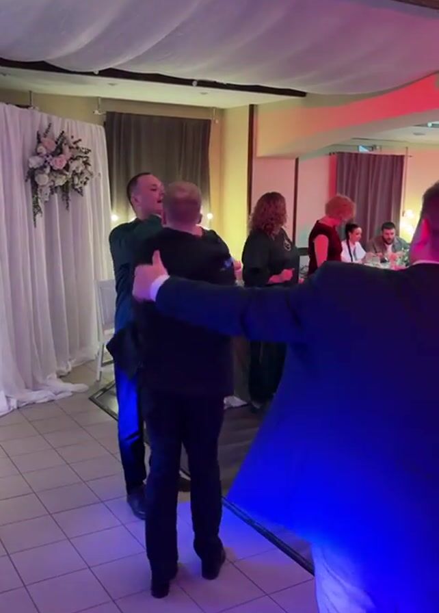 group of people dancing at what appears to be a wedding reception. A man in a black suit is dancing with enthusiasm, interacting with another man in a green shirt. Several other people are standing nearby, some watching the dancing and others talking. The room is decorated with white curtains, floral arrangements, and a draped ceiling. There are tables with seated guests in the background. Colored lights illuminate the dance floor.