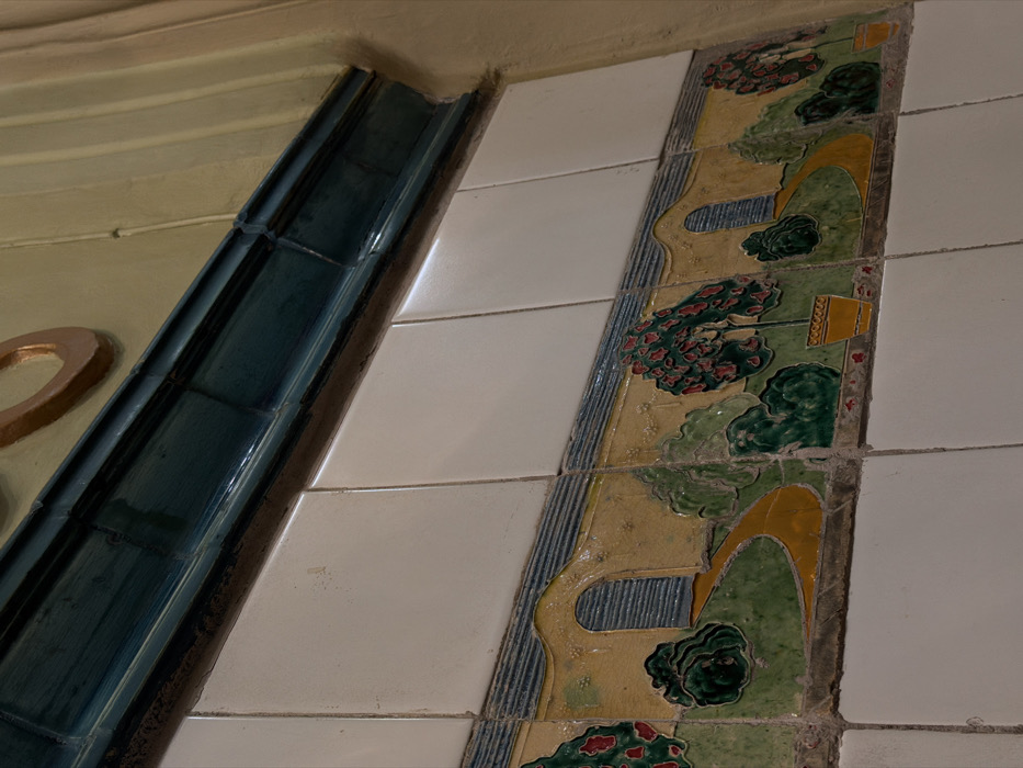An interior wall in Irkutsk, Russia, is depicted, featuring a tiled surface with decorative elements