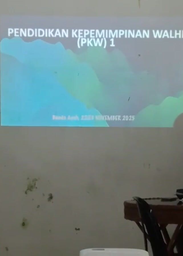 A man in a floral shirt and tan pants is standing in front of a projector screen. The screen displays text in Indonesian. Another man, wearing glasses, is sitting on a chair behind the first man. A projector is visible on a small table. There are some stains on the wall. The men appear to be in a meeting or presentation setting.