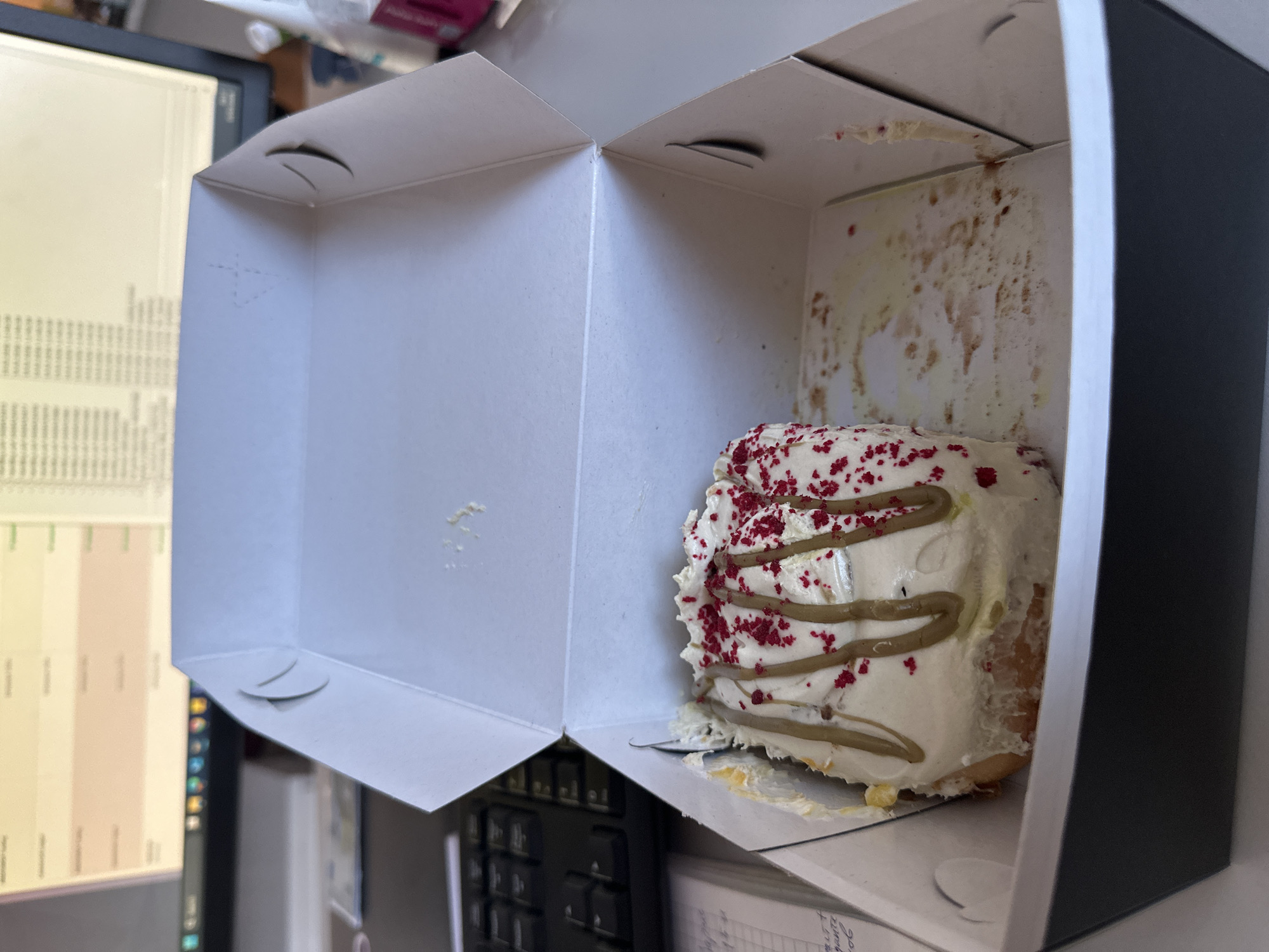 The image presents a high-angle view of a partially consumed cinnamon roll within an open cardboard box, situated in an office environment. The box is predominantly white with a black lower exterior section. Inside, a single cinnamon roll, roughly half-eaten, rests on the left side. It is topped with white frosting, multiple parallel drizzles of a light brown substance, and scattered red sprinkles. The interior base of the box, particularly on the right side, shows residue of white frosting and red sprinkles. In the immediate background to the left, a portion of a black computer keyboard is visible. Below the keyboard, a white ruled notebook or notepad with handwritten text in Cyrillic script is discernible. Further back, occupying the upper right and center portions of the frame, is a computer monitor displaying what appears to be a spreadsheet or calendar application, characterized by rows and columns of data, some highlighted in peach and green against a light background. Faintly visible in the far background on the right are a white cup with green details and a pink container. The scene depicts an indoor workspace. Based on the Cyrillic script on the notebook and the explicit instruction, the location is an office within the city of Sofia, Bulgaria. No individuals are present.