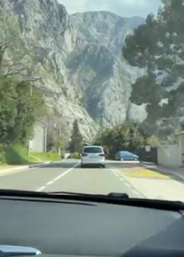view from inside a moving car, driving on a paved road. In front, another white car is driving ahead. To the right of the road is a blue car parked, and some greenery and trees. In the background is a large mountain with rocky faces. The sky is partly cloudy. The camera is stable, and the dashboard of the car is visible at the bottom of the frame.