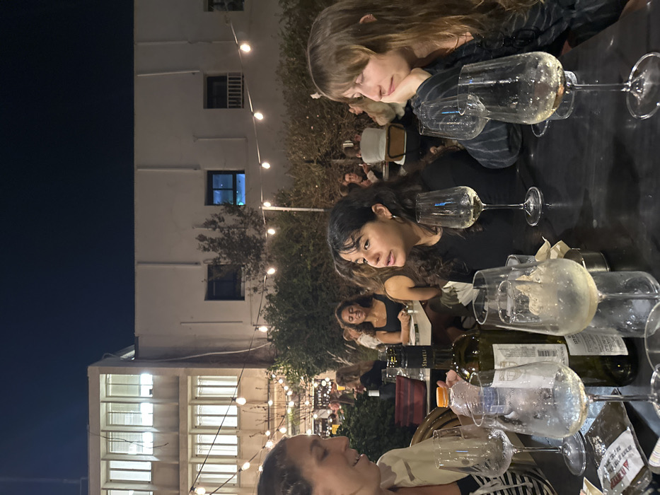The image depicts an outdoor dining area at night in Tel Aviv, Israel. Three adult females are seated at a dark-colored table in the foreground, engaged in conversation. The woman on the left, with dark hair tied back, wears a light-colored jacket over a striped top and smiles while looking towards the center. The central woman has dark, curly hair and wears a black top; she is actively speaking, with her mouth slightly open, looking towards the left. The woman on the right has long, straight brown hair with bangs and wears a dark striped garment; she rests her left hand on her chin, appearing contemplative. On the table are multiple wine glasses, some containing white wine, others empty. A green glass bottle of Semele brand wine from Barkan Winery (with Hebrew text visible) and a plastic water bottle with an orange cap are also present. A small metallic container and a white paper packet are on the table's left side. In the background, beyond a line of green foliage, additional patrons are visible at other outdoor tables, also illuminated by warm string lights stretched across the scene. Behind the dining area, two buildings are discernible: a multi-story, light-colored building on the left with numerous illuminated windows, and a plainer, light-colored building to its right with dark windows, one of which exhibits a blue internal light. The sky above is dark, indicating nighttime.