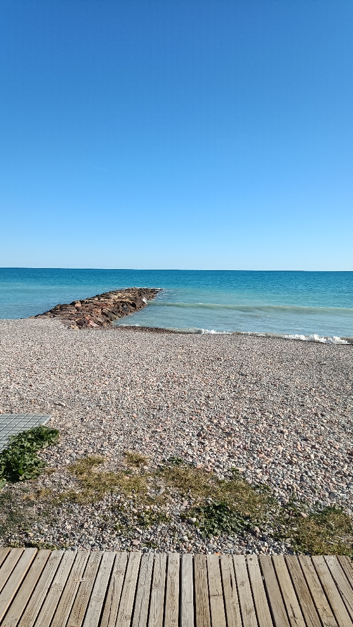 The image depicts a clear, sunny daytime scene at a pebble beach in El Grau De Moncofa, Spain. The foreground features a light brown wooden plank walkway, positioned horizontally at the bottom of the frame, alongside a small section of grey gridded pavement on the far left. Immediately beyond these structures, patches of green and yellowed vegetation grow amidst a vast expanse of light-colored, varied-sized pebbles that constitute the entire beach. Approximately centered in the midground, a dark-colored rock jetty, constructed from large, irregular stones, extends from the left side of the shore into the calm, turquoise-blue sea. Small, white-capped waves are breaking gently near the shoreline, particularly to the right of the jetty. The sea water exhibits a gradual color change, transitioning from a lighter greenish-blue near the immediate shore to a deeper, more saturated blue-green further out towards the horizon. The horizon line is straight and level. The top portion of the image, approximately 40%, is dominated by a clear, unblemished vibrant blue sky, devoid of any clouds. No individuals, animals, or human activity are visible within the scene.