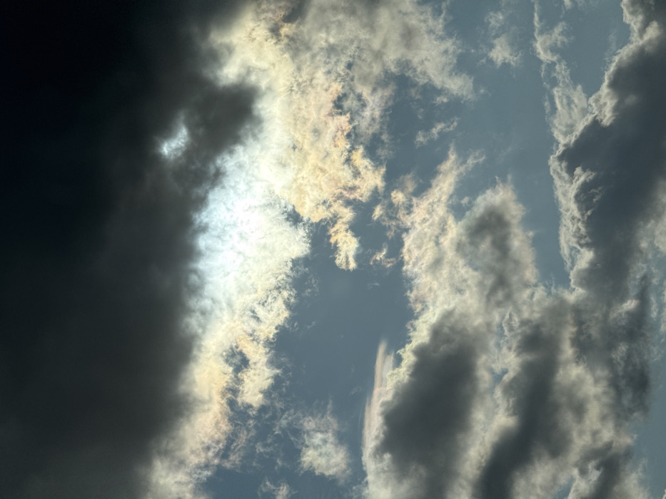 The image depicts a dramatic sky filled with various cloud formations. On the left, a large, dark cloud dominates, contrasting sharply with the bright, sunlit clouds to the right and center. The sunlight shines through the lighter clouds, creating a radiant effect with iridescent colors visible along the edges. A patch of clear, blue sky is visible through the clouds. Overall, the image evokes a sense of dynamic weather, with the interplay of light and shadow emphasizing the sky's depth and texture.