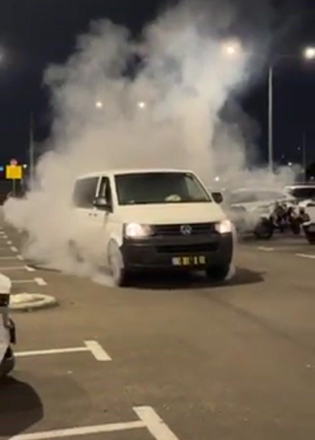 white Volkswagen Transporter van in a parking lot at night, engulfed in a cloud of white smoke. The van is performing a burnout, with smoke billowing from its rear tires. The parking lot has painted parking space lines and there are other cars parked in the vicinity. Streetlights illuminate the scene. The video is shot at ground level with the van being the primary focus. The license plate of the van is visible, but the exact numbers are hard to discern due to motion blur.
