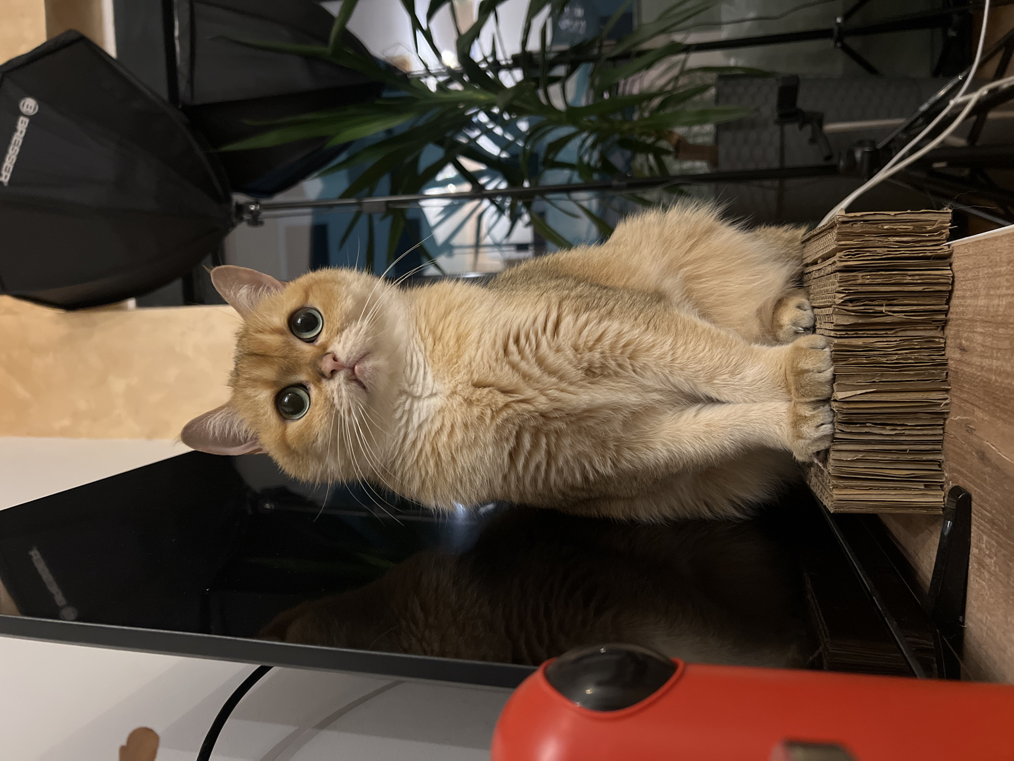 A tan cat with large green eyes lies sideways on a shiny black surface. Its front paws rest on a stack of corrugated cardboard placed against a vertical wooden surface. Behind the cat is a blurred background with a black photography softbox on the left and a potted plant on the right. The scene is indoors, with a red object visible in the lower right corner. The location, Bjeliši, Montenegro, cannot be determined from the image.