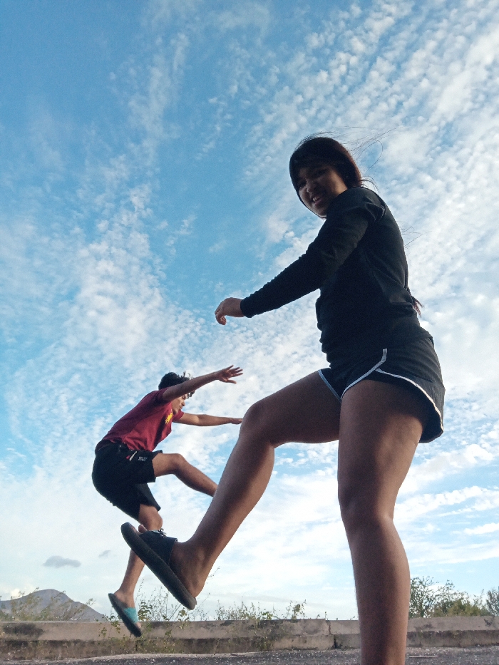 The image depicts two individuals engaged in dynamic poses against a bright blue sky filled with numerous small, scattered white clouds, located in Altagracia, Venezuela. In the foreground, positioned to the right, a person with dark hair, wearing a black long-sleeved top and black shorts with white trim, is shown with their right leg raised and bent at the knee, a dark flip-flop on the right foot. Their left arm is extended forward, and they are looking directly towards the viewer with a slight smile. In the mid-ground, to the left, a second person wearing a maroon short-sleeved t-shirt and dark shorts is captured in mid-air, with both legs bent and elevated off the ground, and both arms extended outwards. A light-colored flip-flop is visible on their left foot. Both individuals are situated above a light-colored concrete barrier or ledge that traverses the lower portion of the frame. Behind this barrier, sparse green vegetation is visible, with distant, low-lying hills under the open sky forming the horizon.