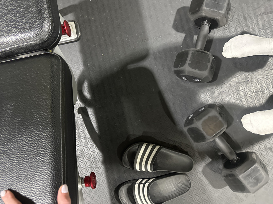 An overhead view depicts an indoor workout area. The floor is covered with dark grey, interlocking rubber mats exhibiting a subtle patterned texture. Along the top edge, the lower portion of a black, textured weight bench or similar fitness equipment is visible, featuring a red adjustment knob on its underside. In the mid-left, two black Adidas adilette slide sandals, each with three white stripes, rest on the mat, positioned with their toes facing away from the viewer. The left sandal shows "adidas" branding on its footbed. Two hexagonal, black rubber-coated dumbbells with metal handles are on the floor in the lower half of the frame; they appear scuffed and worn. At the bottom of the frame, two feet encased in white socks are visible, positioned behind the dumbbells. A hand with light-colored, manicured fingernails grips the edge of the black weight bench in the upper-left corner. Strong shadows are cast across the floor from the equipment and an unseen overhead light source. The image provides no identifiable landmarks or unique features to confirm a specific location within Tonbridge and Malling, United Kingdom.