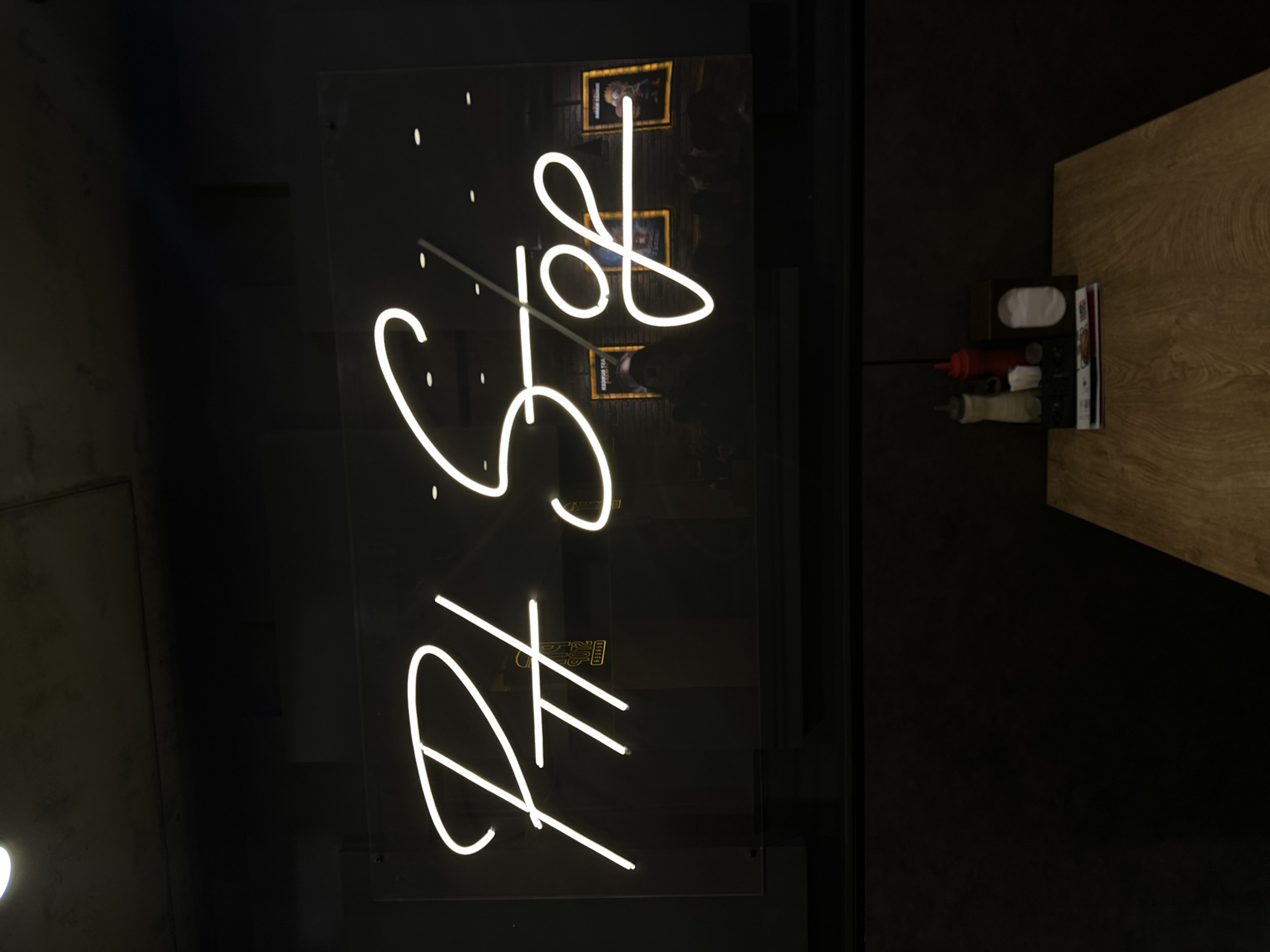 A neon sign on a glass pane displaying "At Stop" is illuminated in a dark environment. The backdrop of the sign displays blurred photos and a shadow silhouette of a person, likely a customer. To the right, a wooden table with condiments and menus adds to the scene. The location is likely Yerevan, Armenia, although this cannot be verified from the image.