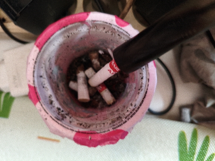 - "The image displays a close-up, overhead view of a repurposed pink and white patterned cup functioning as an ashtray, situated on a light-colored surface featuring a green leaf pattern in the lower left" by FM-UM4Pt1, licensed under CC BY 4.0