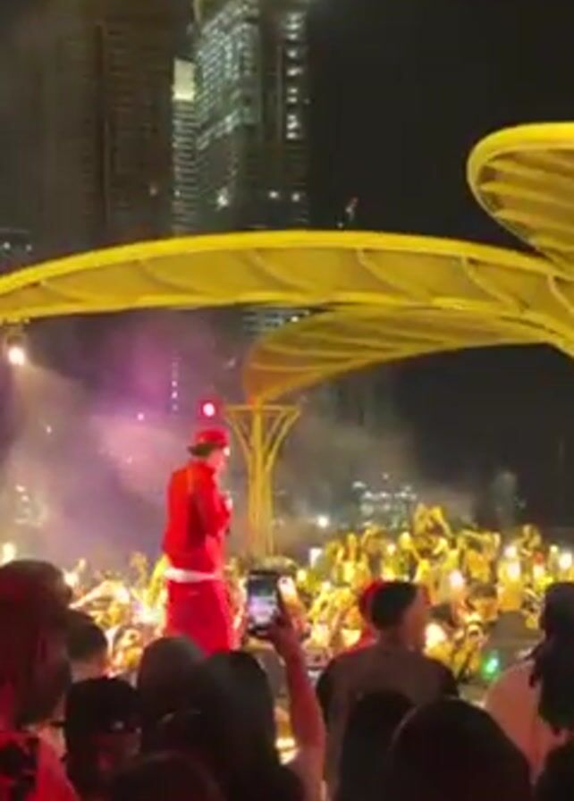 singer performing on a stage in front of a large crowd at night. The singer is wearing a red tracksuit and a red baseball cap. He is holding a microphone and singing to the audience. Many people in the crowd are holding up their phones to record the performance. There are tall buildings in the background. The stage is lit up with bright lights. There is smoke or fog on the stage. A decorative archway frames the top of the shot.