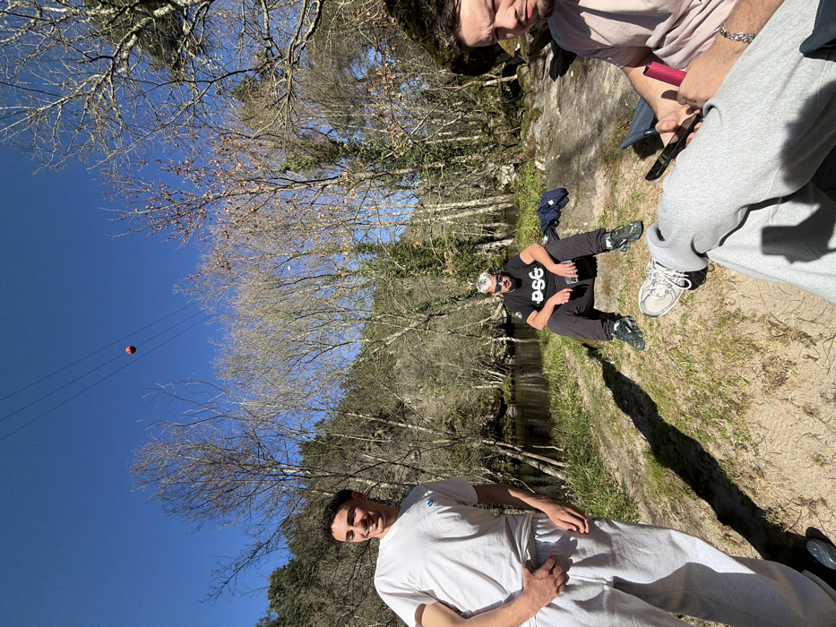 The image displays three adult males in a natural outdoor setting, identified as a riverbank, likely along the Corgo River near Vila Real, Portugal. A male subject stands on the left, facing right with a slight smile. He wears a white short-sleeved t-shirt with a small blue logo on the left chest and light grey sweatpants. A second male subject is seated centrally on a low rock, facing forward. He wears dark sunglasses, a black short-sleeved t-shirt with white "DSG" lettering, black sweatpants, and dark athletic shoes. He holds a smartphone in his right hand. A dark blue jacket is positioned on the ground adjacent to him. A third male subject is partially visible in the foreground on the right, seated with his left leg crossed over his right. He looks directly at the camera with a neutral expression. He wears a light pink or beige short-sleeved t-shirt and a silver bracelet on his left wrist. He holds a black smartphone and a pink cylindrical object in his left hand. His visible lower leg is clad in a grey sweatpant and a light grey athletic shoe. The background features a dark body of water, indicative of a river or stream, bordered by a dense woodland. The trees are predominantly deciduous and largely bare, suggesting late winter or early spring. The sky is clear and blue. Three parallel utility lines, possibly power lines, traverse the upper sky, with a single red spherical marker attached to one of the central wires. The ground consists of dirt and dry vegetation. Strong shadows cast across the terrain indicate bright sunlight.