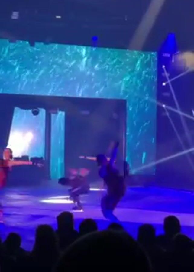 A stage performance is taking place with multiple dancers in view, illuminated by purple and white lights. There is a large screen behind them displaying abstract blue and green visuals. The dancers wear various costumes including red dresses and dark outfits. Some are performing acrobatic moves. The audience is visible in the foreground, primarily as silhouettes.