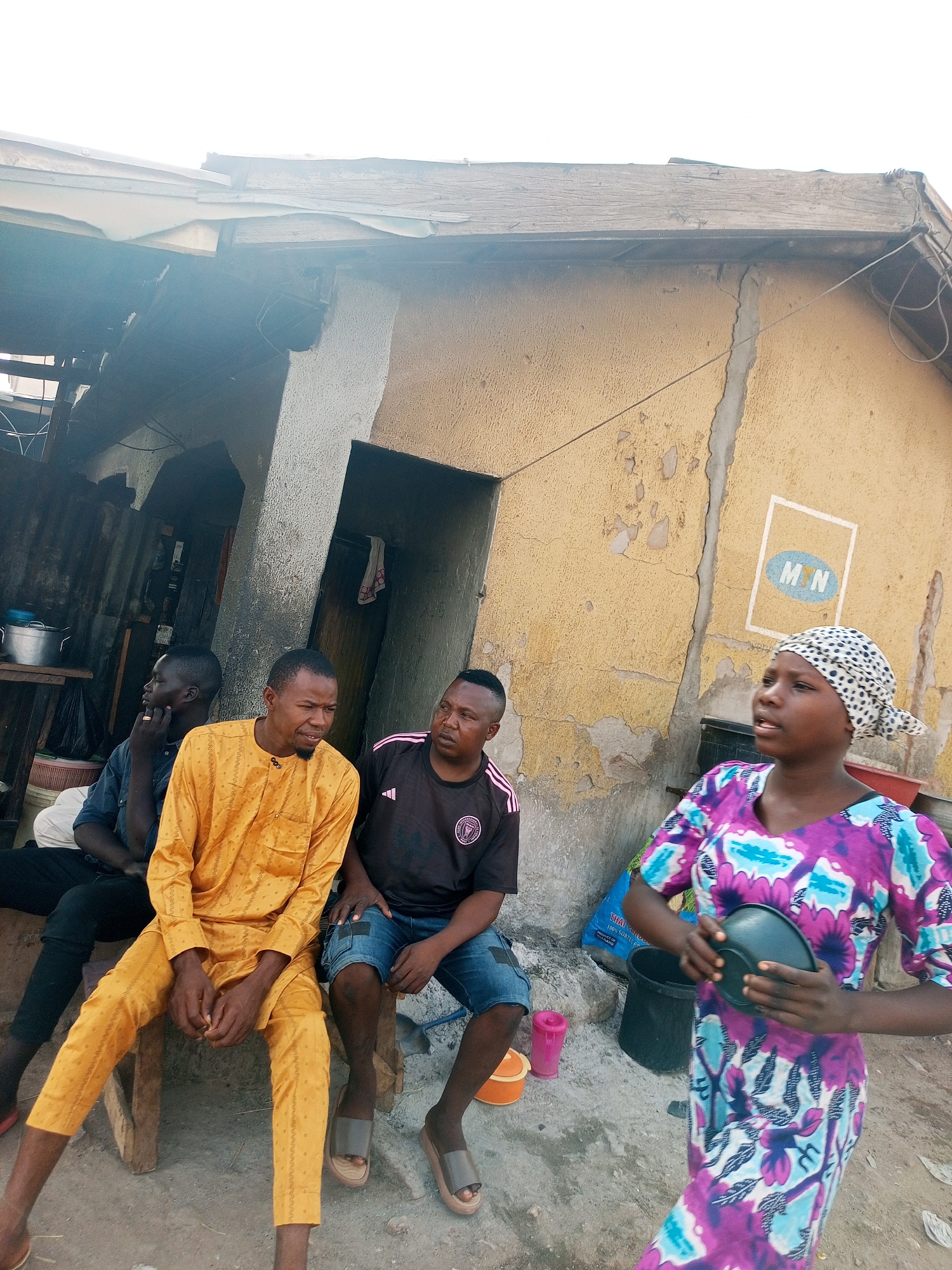 This image depicts an outdoor scene in Gombe, Nigeria, featuring four individuals near a weathered building. **Environment:** The primary background consists of a single-story building with a faded yellow, textured facade exhibiting significant paint peeling and crumbling plaster. A distinct vertical crack runs down the wall. Above, exposed wooden beams support a corrugated roof. A white rectangular outline containing the letters "M N" is painted on the yellow wall to the right of the crack. To the left, a darker section of the building includes an open doorway and a wooden shelf holding a silver pot with a blue lid. The ground is an uneven surface of light-colored concrete or packed earth. The sky above is bright and overcast. **People:** 1. **Woman:** Positioned on the right side of the frame, standing and facing towards the left. She wears a white headscarf with black polka dots and a long, multi-colored dress with purple, blue, and white floral patterns. Both hands are holding a dark, possibly black, bowl or container at waist level. Her mouth is slightly open. 2. **Man 1 (Yellow Attire):** Seated on a low wooden bench to the left of the woman. He wears a long-sleeved, collared yellow tunic with a subtle pattern and matching yellow trousers, along with light-colored open-toed sandals. He faces slightly towards the man in the black shirt, with his hands clasped in front of him. 3. **Man 2 (Black Shirt):** Seated next to Man 1, to the left. He wears a black t-shirt with pink stripes on the shoulders and a dark emblem on the chest. He also wears blue denim shorts and light-colored open-toed sandals. He looks towards Man 1. 4. **Man 3 (Leftmost):** Partially obscured, seated to the far left. He wears a dark shirt and dark trousers. He is looking to his left, with his right hand supporting his chin. **Objects:** Visible objects on the ground include a small orange container, a pink plastic cup near the seated men, and a black plastic bucket and a blue and white sack near the standing woman.