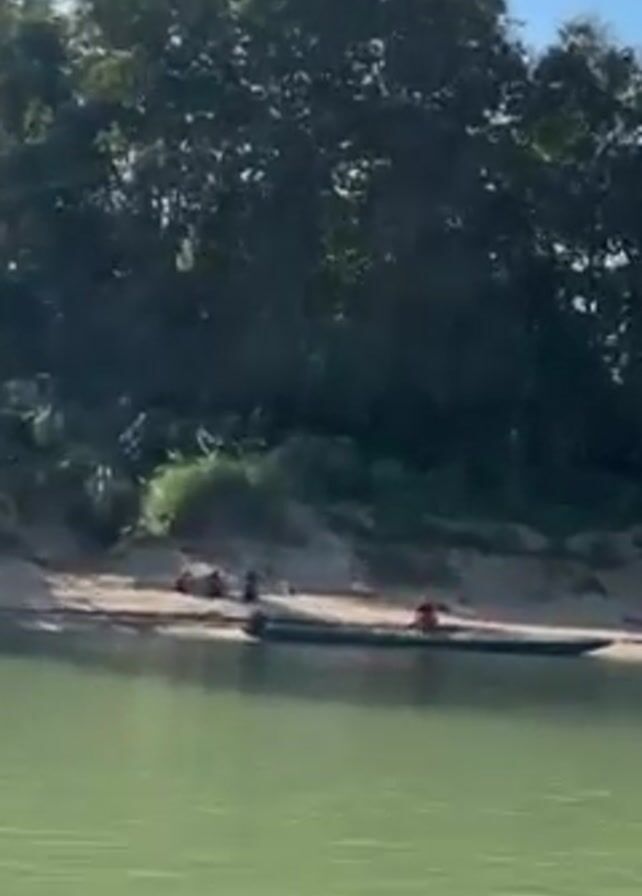 wide river with murky, green water. On the sandy bank, a group of people are gathered near a long, dark boat. Some people are sitting or standing, while one person in a red shirt appears to be working on or near the boat. Lush green trees cover the background of the bank, with a clear, bright blue sky overhead. The camera is moving, suggesting it is being filmed from another boat on the river.