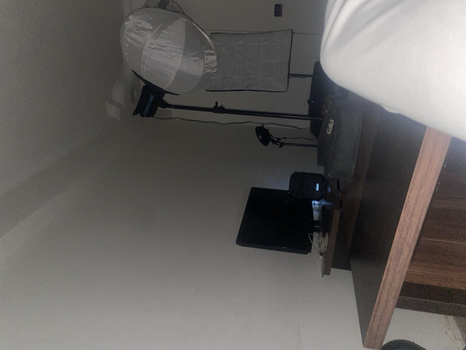 A white softbox and a rectangular reflector are positioned on stands. A black camera bag labeled "CAT" and a black monitor sit on a dark brown desk. The monitor is next to a black bag that appears to be a camera accessory bag. The wall is painted a light grey. A small square black electrical outlet is also visible on the wall. Part of a white item is in the upper right corner.